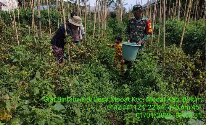 B O L T I M – – Wujud nyata kepedulian TNI terhadap ketahanan pangan dan kesejahteraan masyarakat terus ditunjukkan oleh Babinsa di wilayah binaannya. Seperti yang dilakukan Babinsa Desa Mooat Kabupaten Bolaang Mongondow Timur, Sertu Tahir Ali yang turun langsung membantu petani saat panen tomat, Minggu (01/01/2026).