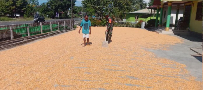 B O L M O N G – – Di bawah terik matahari yang menyelimuti Dusun Dua Desa Cempaka Kecamatan Sangtombolang Kabupaten Bolaang Mongondow, tampak kebersamaan yang sederhana namun sarat makna. Seorang prajurit TNI dengan seragam loreng menyatu bersama warga, ikut menghampar dan merapikan jagung hasil panen. Bukan dalam rangka seremoni, melainkan wujud nyata kepedulian dan pengabdian tanpa sekat.