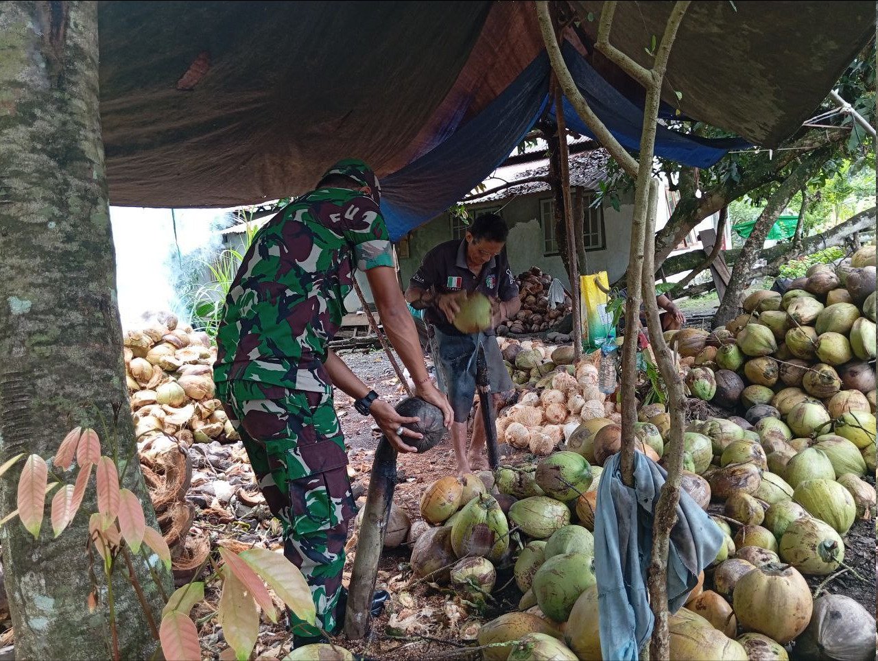 Di lokasi kegiatan, terlihat tumpukan kelapa hasil panen yang mencapai sekitar kurang lebih 500 buah. Proses pengupasan yang biasanya memerlukan tenaga ekstra menjadi lebih ringan karena dilakukan secara bersama-sama. Babinsa pun turun langsung membantu pekerjaan warga dengan penuh semangat.