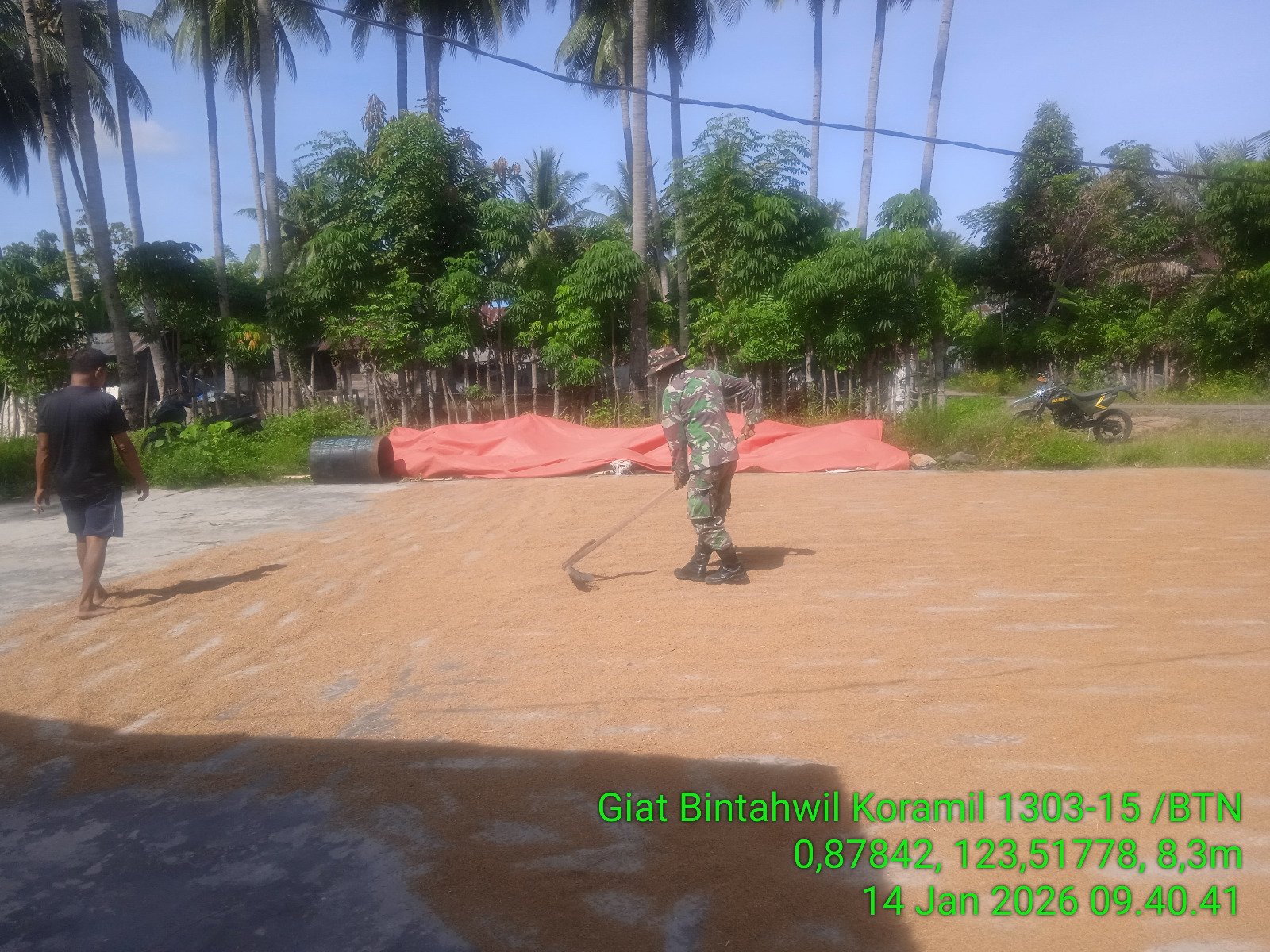 B O L M U T – – Dalam rangka melaksanakan pembinaan Ketahanan Wilayah atau Bintahwil sekaligus mendukung ketahanan pangan di wilayah binaan, Babinsa Koramil 1303-15/Bintauna Sertu Ismail Talibo melaksanakan pendampingan kepada petani dalam kegiatan penjemuran padi yang berada di Desa Bunong Kecamatan Bintauna Kabupaten Bolaang Mongondow Utara, Rabu (14/01/2026).