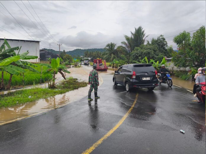 Menindaklanjuti kejadian tersebut, Babinsa Koramil 1303-12/Sangtombolang Sertu Aris Manto segera melaksanakan pemantauan langsung di lokasi terdampak. Selain memastikan kondisi warga dalam keadaan aman, Babinsa juga membantu mengatur arus lalu lintas agar kendaraan roda dua maupun roda empat dapat melintas dengan tertib dan hati-hati pada titik genangan.
