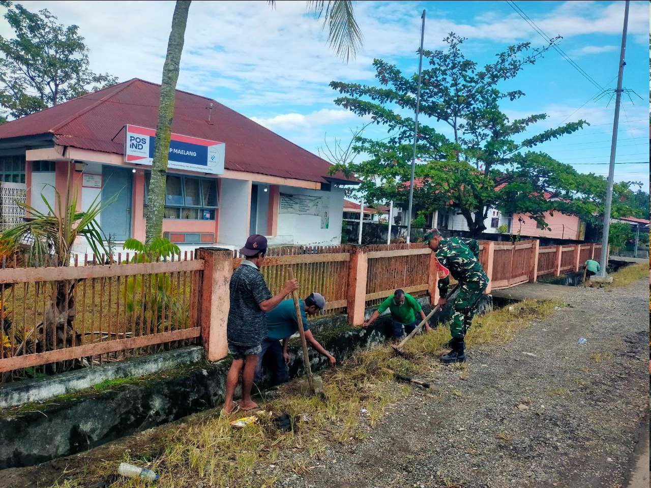 Babinsa Sertu Jufri Ronald Leleh melaksanakan kegiatan kerja bhakti bersama masyarakat sekitar dengan fokus pada pembersihan sampah-sampah yang menyumbat selokan dan saluran drainase. Kegiatan ini bertujuan untuk mengantisipasi terjadinya genangan air dan potensi banjir, khususnya menjelang dan selama musim hujan.
