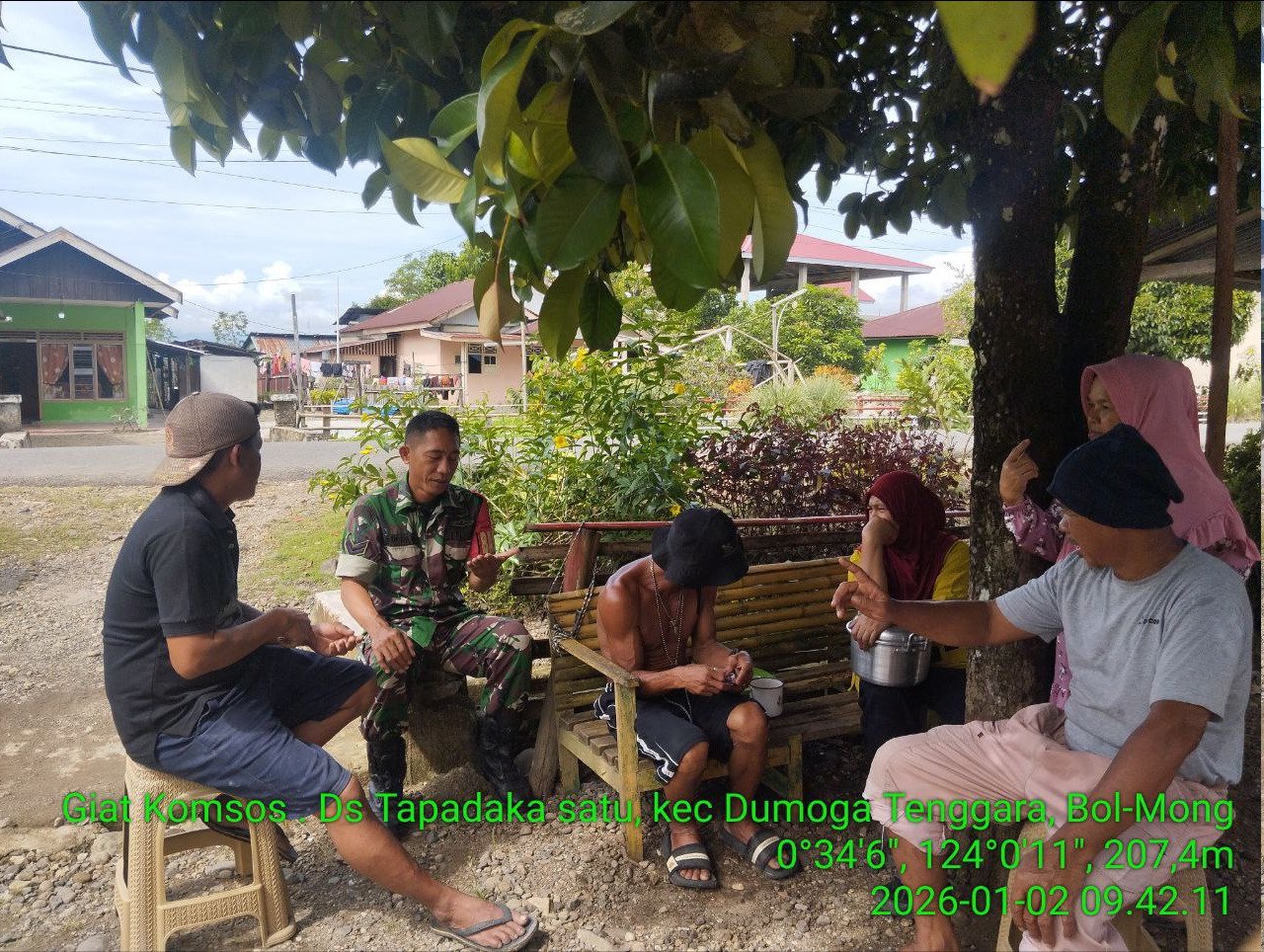 B O L M O N G – – Sebagai wujud kepedulian terhadap kondisi sosial dan keamanan wilayah binaan, Bintara Pembina Desa atau Babinsa Koramil 1303-07/Dumoga Serda Hendra Manggo, melaksanakan kegiatan Komunikasi Sosial (Komsos) bersama masyarakat Desa Tapadaka Satu, Kecamatan Dumoga Tenggara, Kabupaten Bolaang Mongondow, Jumat (02/02/2025).