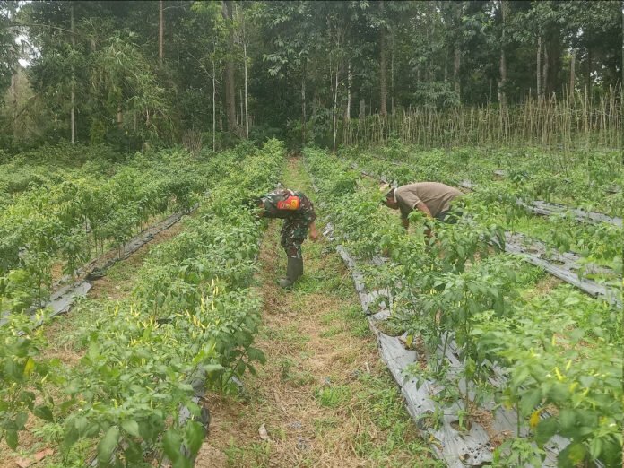 Kegiatan yang berlangsung penuh keakraban tersebut menjadi bukti kedekatan Babinsa dengan masyarakat. Kopda Roly tampak bahu-membahu bersama warga membersihkan gulma dan merapikan tanaman cabai agar dapat tumbuh dengan baik serta menghasilkan panen yang optimal.