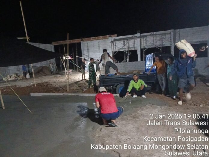 B O L S E L – – Bintara Pembina Desa atau Babinsa Koramil 1303-7/Posigadan Pratu Made Yasa turut mendampingi kegiatan lembur malam yang dilakukan oleh Koperasi Desa/Koperasi Merah Putih (KDKMP) Desa Pilolahunga dalam rangka percepatan pengecoran lantai bangunan koperasi, Jumat (02/01/2026) sekitar pukul 20.00 Wita.