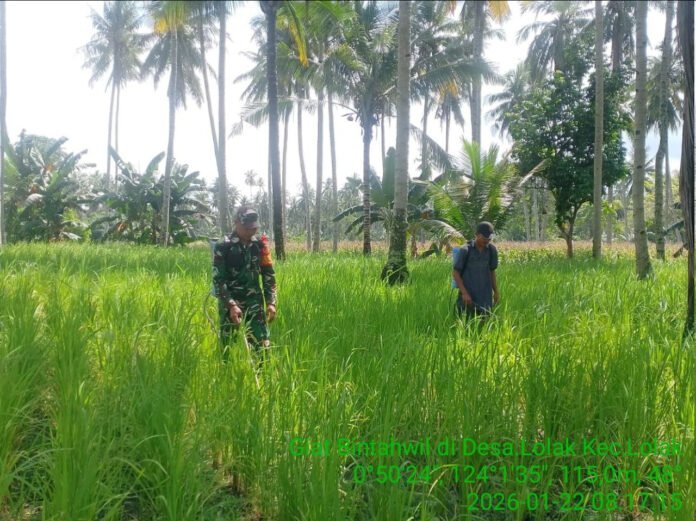 B O L M O N G – – Kehadiran TNI di tengah masyarakat tidak hanya terlihat dalam tugas pengamanan saja akan tetapi juga dalam berbagai aktivitas keseharian warga. Hal inilah yang ditunjukkan oleh Bintara Pembina Desa atau Babinsa Koramil 1303-11/Lolak Sertu Febrianto Simbala, yang dengan penuh kepedulian turun langsung membantu warga binaannya dalam kegiatan Bintahwil (Pembinaan Ketahanan Wilayah), berupa penyemprotan gulma pada tanaman padi ladang milik masyarakat.