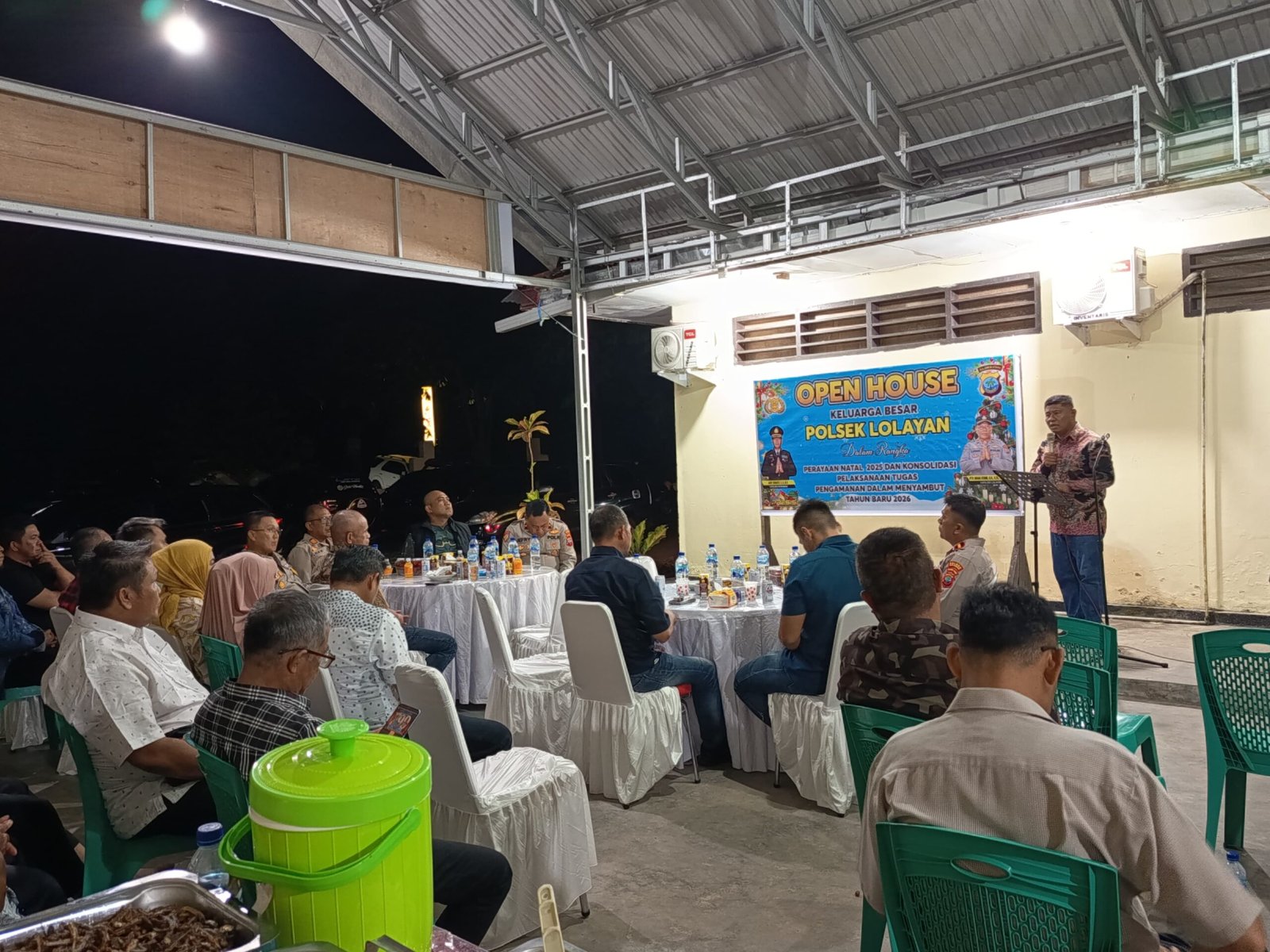 Jajaran Polsek Lolayan menggelar acara Open House perayaan Natal 2025 yang dirangkaikan dengan konsolidasi kesiapan pengamanan malam pergantian tahun 2026.