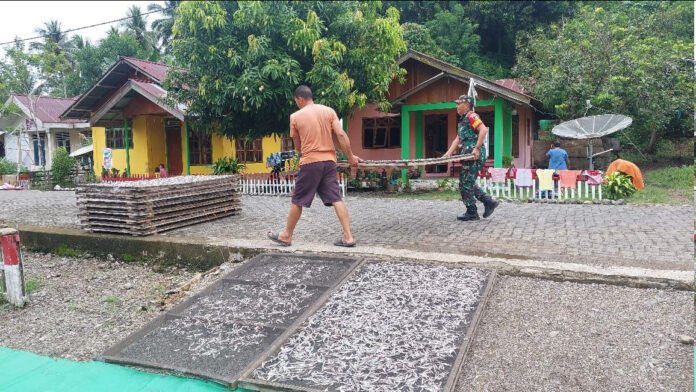 Kegiatan tersebut merupakan bagian dari Pembinaan Ketahanan Wilayah (Bintahwil) yang rutin dilaksanakan Babinsa sebagai upaya memperkuat hubungan sosial sekaligus mendukung ketahanan ekonomi masyarakat. Kali ini, Sertu Roy Jefferson Pitoy membantu Bapak Masril Gobel, warga Desa Sauk yang mengelola usaha pengolahan ikan teri secara tradisional.