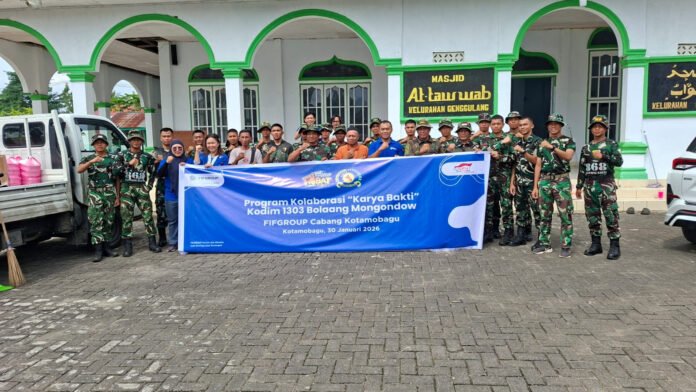 KOTAMOBAGU – – Semangat gotong royong dan kepedulian terhadap lingkungan terus tumbuh di tengah masyarakat Kota Kotamobagu. Menjelang datangnya Bulan Suci Ramadhan, nilai kebersamaan itu tampak nyata melalui kegiatan Karya Bakti yang digelar Kodim 1303/Bolaang Mongondow bersama FIF Group Kotamobagu, Jumat (30/01/2026). Kegiatan ini menjadi wujud kolaborasi humanis antara TNI, dunia usaha, dan masyarakat dalam menciptakan lingkungan rumah ibadah yang nyaman dan layak digunakan.