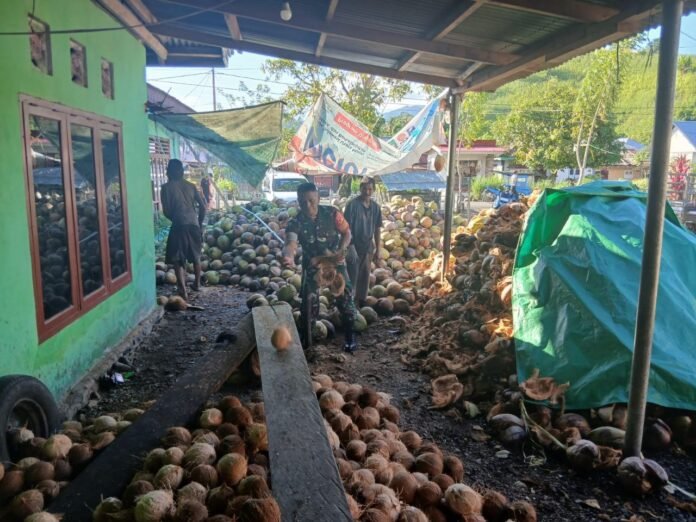 BerandaBolmongLewat Gotong Royong, Babinsa Diat Bantu Warga Kupas Ratusan Kelapa