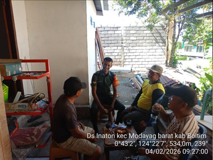 B O L T I M – – Dalam rangka mempererat kemanunggalan TNI dengan rakyat, Bintara Pembina Desa atau Babinsa Koramil 1303-03/Modayag, Sertu Agus Sayono, melaksanakan kegiatan Komunikasi Sosial (Komsos) bersama masyarakat Desa Inaton Kecamatan Modayag Barat Kabupaten Bolaang Mongondow Timur, Rabu (04/02/2026).