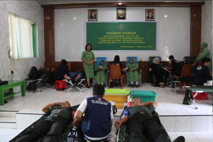 KOTAMOBAGU – – Semangat kebersamaan dan kepedulian terhadap sesama tampak nyata di Aula Totabuan Kodim 1303/Bolaang Mongondow, Senin (02/02/2026). Sejak pagi hari, prajurit TNI, anggota Persit Kartika Chandra Kirana, Polri, hingga masyarakat binaan hadir dengan satu tujuan mulia: menyumbangkan darah sebagai bentuk pengabdian kemanusiaan.