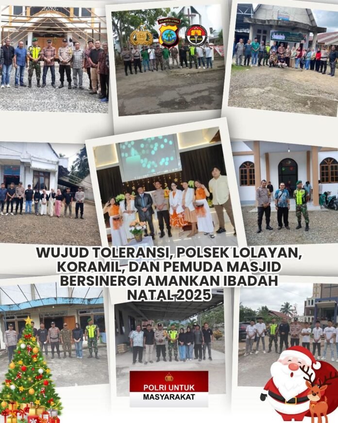 ANALISASULUT.COM LOLAYAN – Suasana khidmat dan penuh persaudaraan mewarnai pelaksanaan ibadah Natal tahun 2025 di wilayah hukum Polsek Lolayan. Pengamanan ibadah di sejumlah gereja tidak hanya dilakukan oleh aparat kepolisian, tetapi juga melibatkan personel TNI dari Koramil 04 Lolayan serta partisipasi aktif dari Pemuda dan Remaja Masjid setempat, Kamis (25/12/2025).