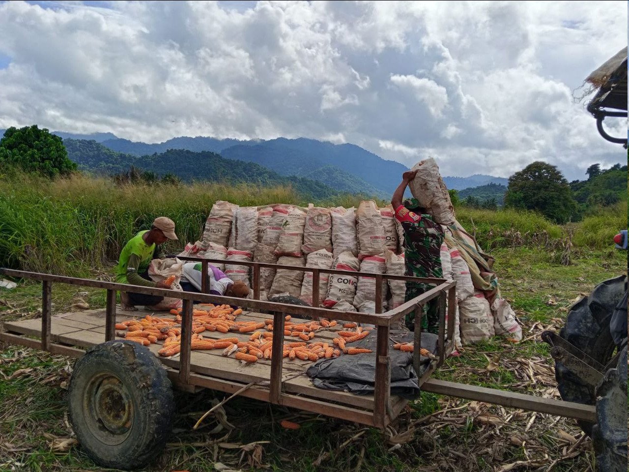 B O L M O N G – – Di tengah hamparan ladang jagung Desa Dulangon, kebersamaan antara TNI dan rakyat kembali terjalin hangat. Babinsa jajaran Kodim 1303/Bolaang Mongondow tampak bahu-membahu bersama petani mengangkat jagung hasil panen, sebagai wujud kepedulian dan komitmen TNI dalam mendampingi masyarakat di wilayah binaannya.